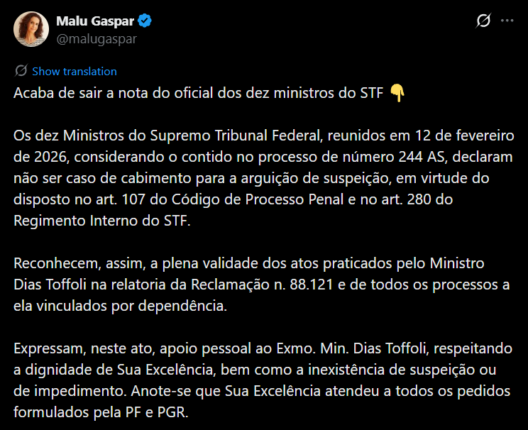 O ministro Dias Toffoli, do Supremo Tribunal Federal (STF), renunciou nesta quinta-feira (12) à relatoria das investigações envolvendo o Banco Master.