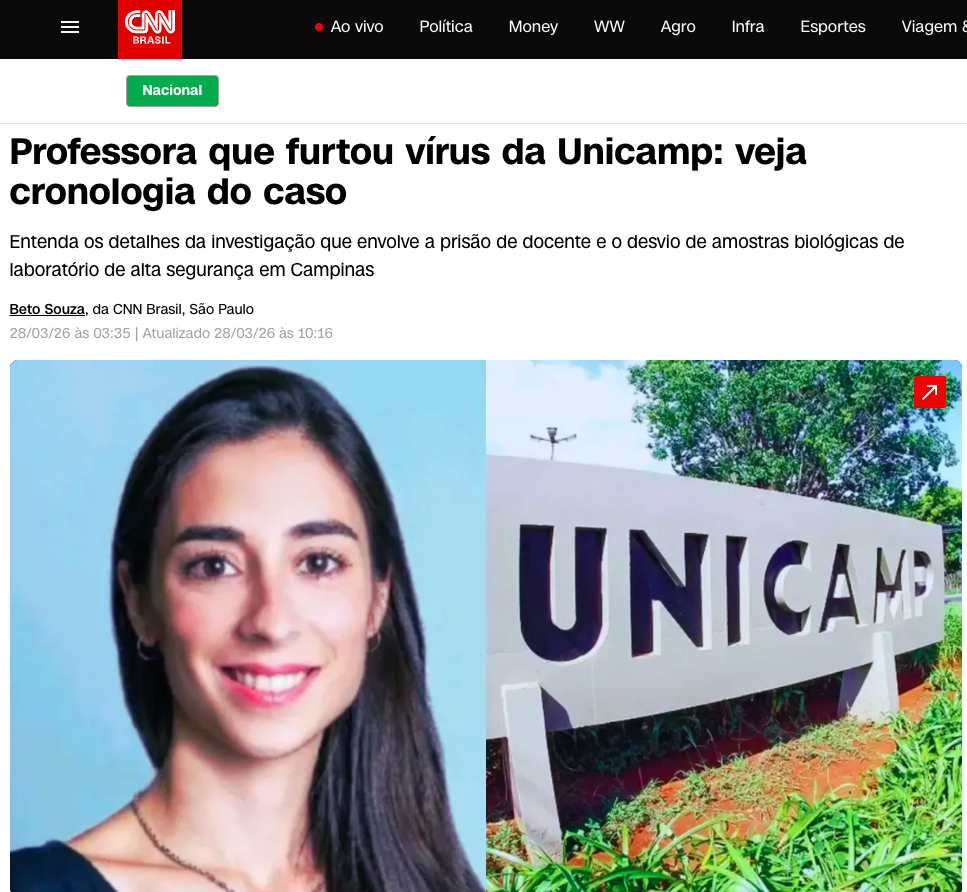 A Polícia Federal prendeu em flagrante a professora Soledad Palameta Miller, docente da Faculdade de Engenharia de Alimentos da Universidade Estadual de Campinas (Unicamp), sob suspeita de furtar amostras virais de um laboratório de alta contenção biológica, de acordo com a matéria da CNN BRASIL.