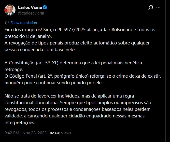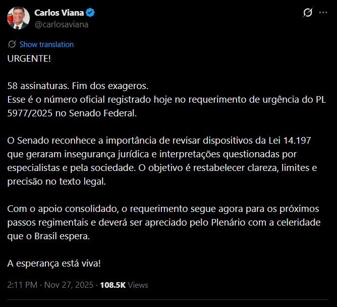 – URGENTE! 58 assinaturas. Fim dos exageros. Esse é o número oficial registrado hoje no requerimento de urgência do PL 5977/2025 no Senado Federal. O Senado reconhece a importância de revisar dispositivos da Lei 14.197 que geraram insegurança jurídica e interpretações questionadas por especialistas e pela sociedade – escreveu Viana no X.