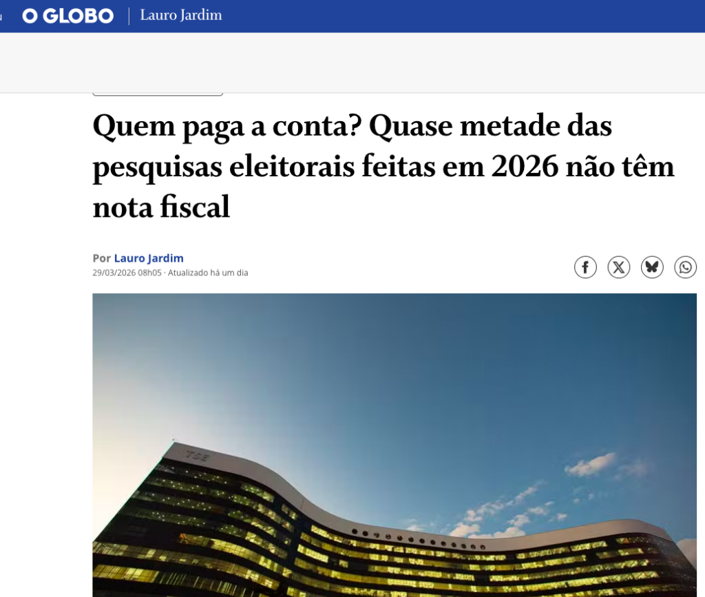 Há um mistério a ser explicado na enxurrada de pesquisas eleitorais desta temporada: 46% delas, realizadas em 2026, não apresentam nota fiscal, sob alegação de que o trabalho é financiado com recursos próprios, de acordo com a matéria do O GLOBO.
