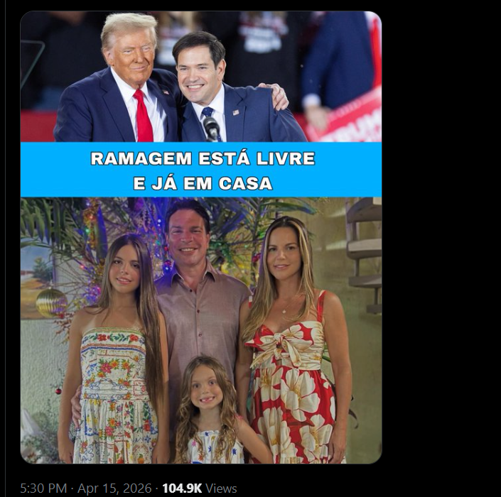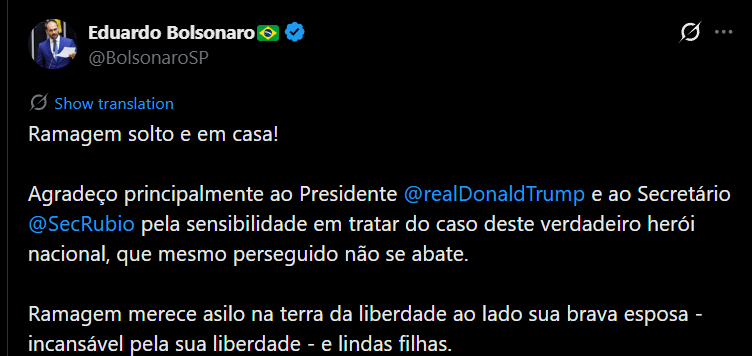 Após a excelente notícia,. Eduardo Bolsonaro comemorou a libertação e agradeceu a Trump e ao secretário de Estado americano, Marco Rubio. Confira abaixo a postagem: