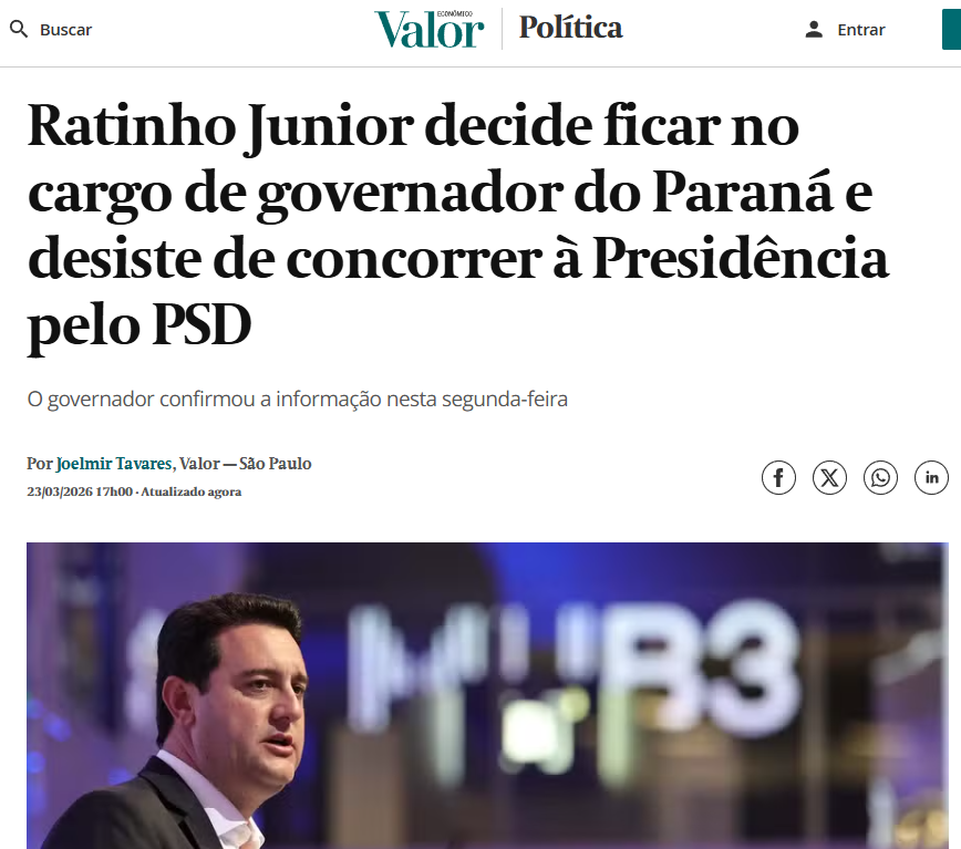 O governador do Paraná, Ratinho Junior, anunciou nesta segunda-feira (23) que ficará no cargo e desistiu do processo do PSD para a escolha de um candidato à Presidência da República. Ele disputava a indicação do partido com os governadores de Goiás, Ronaldo Caiado, e do Rio Grande do Sul, Eduardo Leite. A previsão anterior era que o nome fosse escolhido nesta semana.