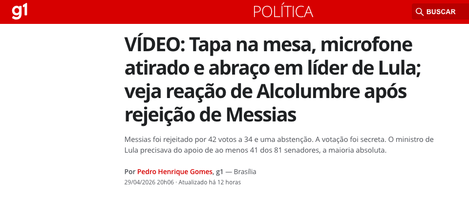A cena, registrada em vídeo pela TV Senado, ocorreu na noite de quarta-feira (29), momentos depois de o plenário rejeitar o nome do advogado-geral da União. Messias obteve apenas 34 votos favoráveis contra 42 contrários e uma abstenção. Para ser aprovado, o indicado precisava de pelo menos 41 votos.