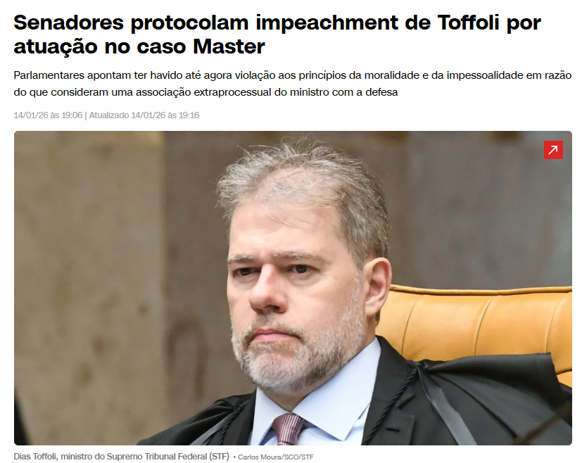 Senadores da oposição protocolaram na tarde desta quarta-feira (14) um pedido de impeachment do ministro do STF (Supremo Tribunal Federal) Dias Toffoli, apontando o que consideram haver crimes de responsabilidade em sua atuação no caso do Banco Master.