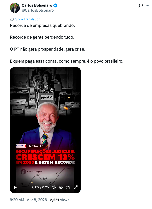 Carlos Bolsonaro se manifestou sobre o novo recorde de recuperações judicias que chega a 2.466, confira:
