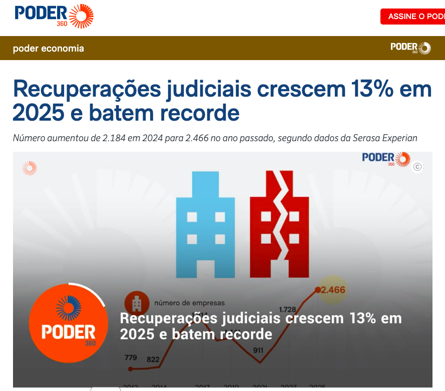 O número de empresas em recuperação judicial no Brasil atingiu um novo recorde em 2025. De acordo com dados da Serasa Experian, foram registradas 2.466 recuperações judiciais no ano passado, o que representa um aumento de 13% em relação às 2.184 registradas em 2024, de acordo com a matéria do Poder360.