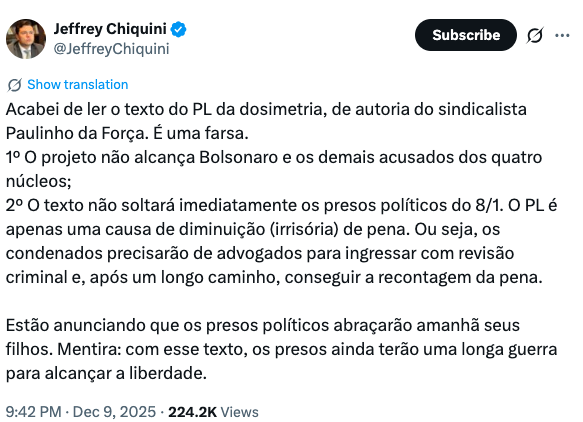 - Redução específica para quem atuou em “contexto de multidão”: Cria dispositivo para diminuição de um terço a dois terços da pena a réus que participaram sem exercer liderança ou financiar as mobilizações, reconhecendo o “calor do momento” em atos coletivos.