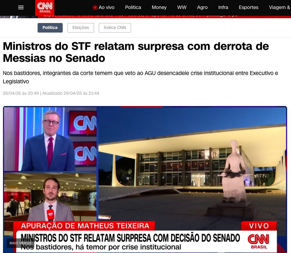 De acordo com a reportagem, os magistrados afirmam, sob reserva, que foram surpreendidos pela derrota do indicado. Nos corredores do tribunal, há preocupação de que o veto ao nome de Messias possa desencadear uma crise institucional entre o Poder Executivo e o Legislativo.