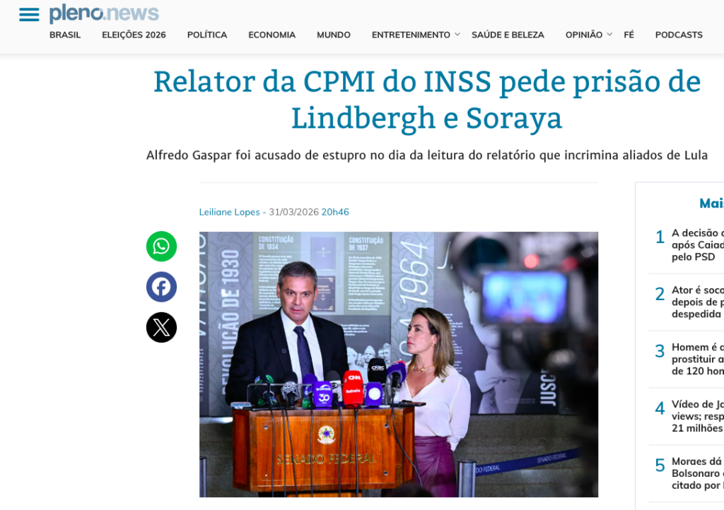 O relator da Comissão Parlamentar Mista de Inquérito (CPMI) que investiga fraudes no Instituto Nacional do Seguro Social (INSS), deputado federal Alfredo Gaspar (PL-AL), anunciou que protocolou pedido de prisão contra o deputado Lindbergh Farias (PT-RJ) e a senadora Soraya Thronicke (Podemos-MS). A medida foi tomada após os dois parlamentares o acusarem de estupro de vulnerável durante os trabalhos da comissão, de acordo com a matéria do PLENO.NEWS.