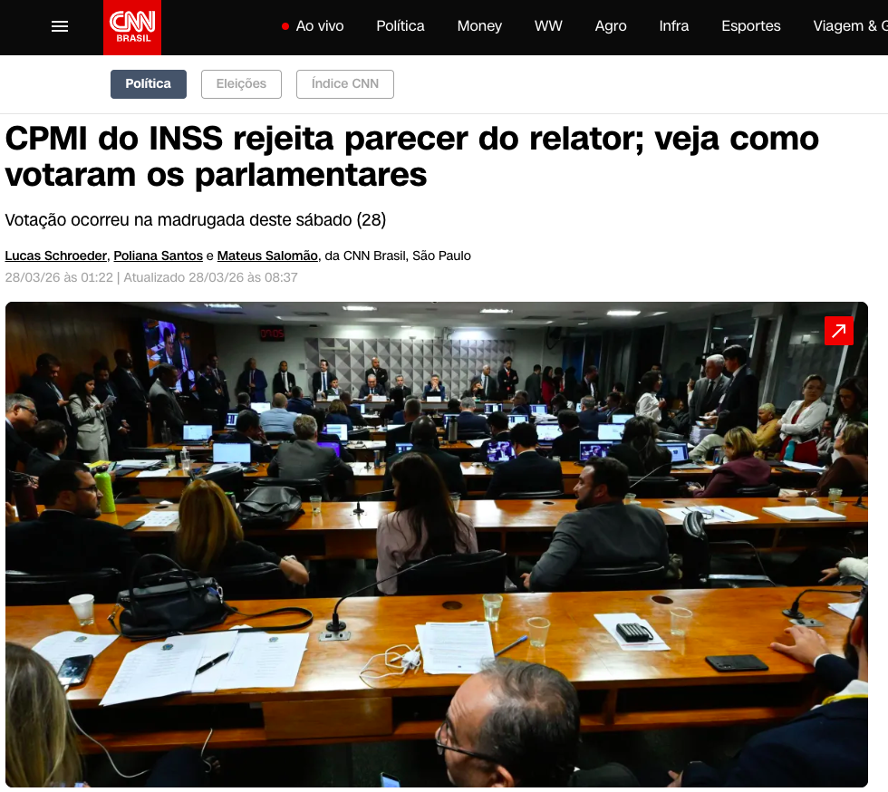 A Comissão Parlamentar Mista de Inquérito (CPMI) do INSS rejeitou, na madrugada deste sábado (28), o parecer final apresentado pelo relator, deputado Alfredo Gaspar (PL-AL). O texto, que recomendava o indiciamento de mais de 200 pessoas envolvidas no esquema de descontos irregulares em benefícios previdenciários, foi derrubado por 19 votos contra e 12 a favor, de acordo com a matéria da CNN BRASIL.