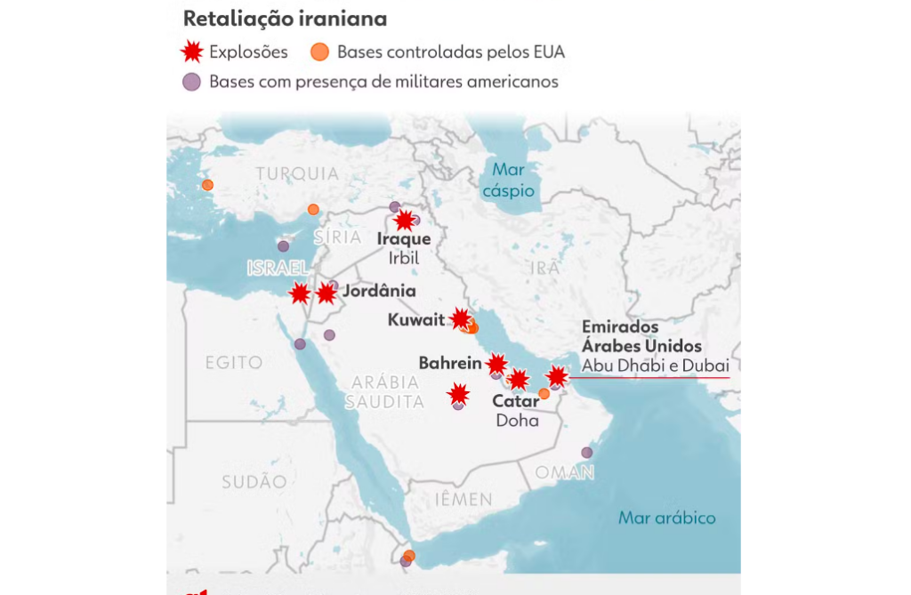 A retaliação do Irã aos ataques coordenados por Estados Unidos e Israel neste sábado (28 de fevereiro de 2026) expandiu o conflito para além dos alvos militares, com destroços de mísseis interceptados e possíveis falhas de precisão atingindo áreas civis em países vizinhos que não eram alvos diretos.