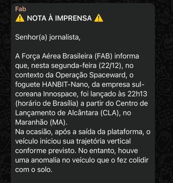 O primeiro lançamento comercial de um foguete a partir do território brasileiro terminou em falha técnica na noite de segunda-feira (22/12), quando o veículo sul-coreano HANBIT-Nano, desenvolvido pela empresa Innospace, apresentou uma anomalia e explodiu minutos após a decolagem no Centro de Lançamento de Alcântara (CLA), no Maranhão.