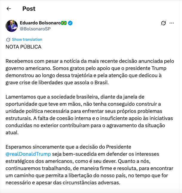 “Recebemos com pesar a notícia da mais recente decisão anunciada pelo governo americano. Somos gratos pelo apoio que o presidente Trump demonstrou ao longo dessa trajetória e pela atenção que dedicou à grave crise de liberdades que assola o Brasil.”