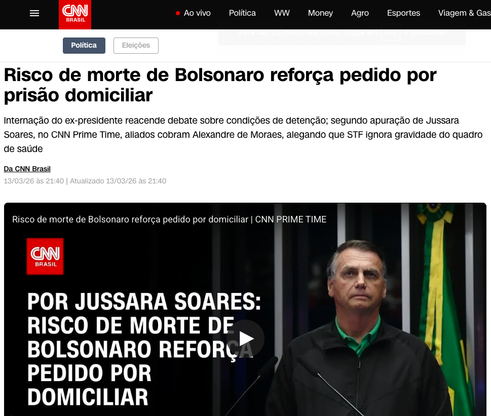 A defesa do presidente Jair Bolsonaro (PL) reforçou, nesta sexta-feira (13), o pedido de prisão domiciliar junto ao Supremo Tribunal Federal (STF), alegando risco de morte em razão do quadro de saúde agravado. O requerimento foi protocolado horas após Bolsonaro ser diagnosticado com broncopneumonia, quadro que exigiu internação no Hospital das Forças Armadas (HFA) após vômitos, calafrios e queda acentuada de saturação de oxigênio durante a madrugada na Papudinha (19º Batalhão da PMDF), de acordo com a matéria da CNN BRASIL.
