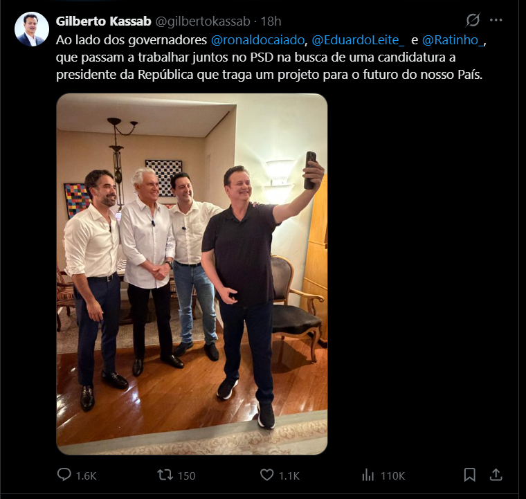 Nas redes sociais Gilberto Kassab postou uma foto da união do SABOR DIREITA. Confira: