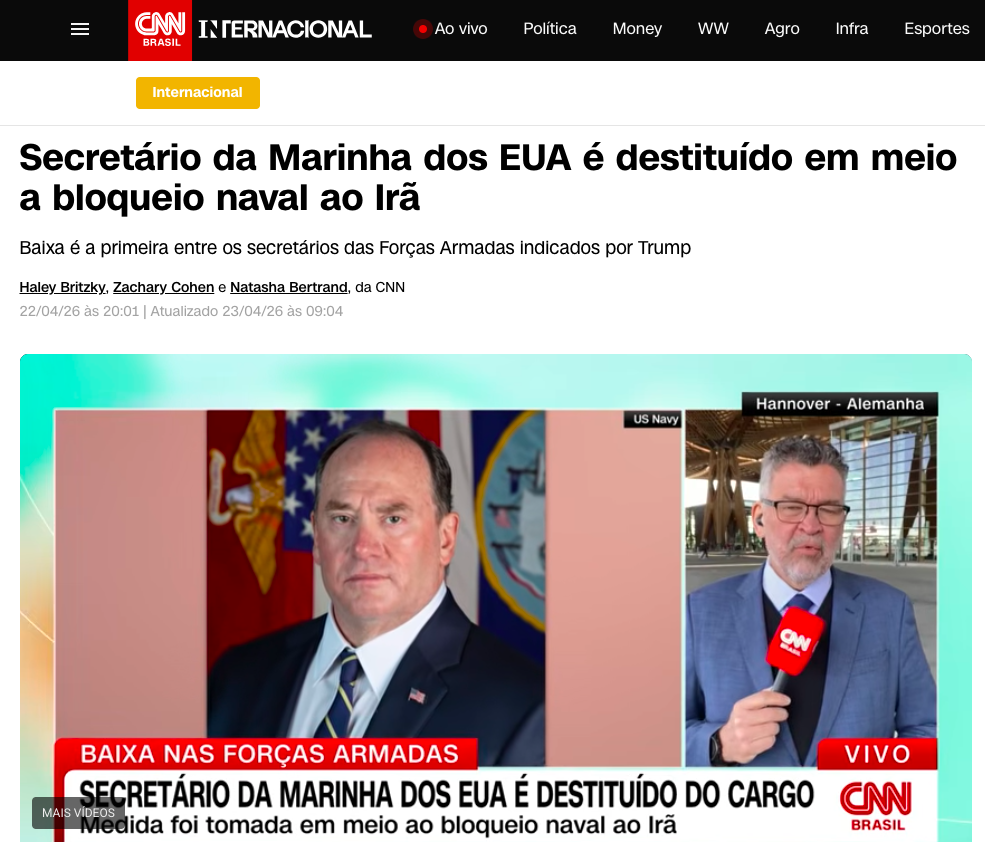 A saída do chefe civil da Marinha acontece em meio à maior mobilização naval das últimas décadas. Atualmente, os EUA mantêm mais de 20 navios de guerra na região para interceptar petroleiros e monitorar a atividade de Teerã.