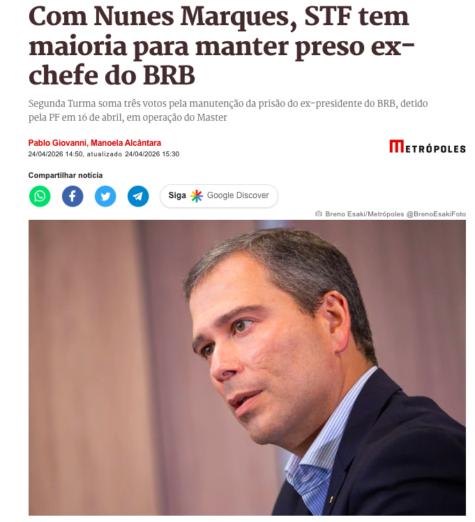 O Supremo Tribunal Federal (STF) formou maioria nesta sexta-feira para manter o regime de prisão preventiva de Paulo Henrique Costa, ex-presidente do Banco de Brasília (BRB). A decisão ocorre no âmbito da Segunda Turma, que analisa o pedido de liberdade apresentado pela defesa do executivo, preso na última semana.