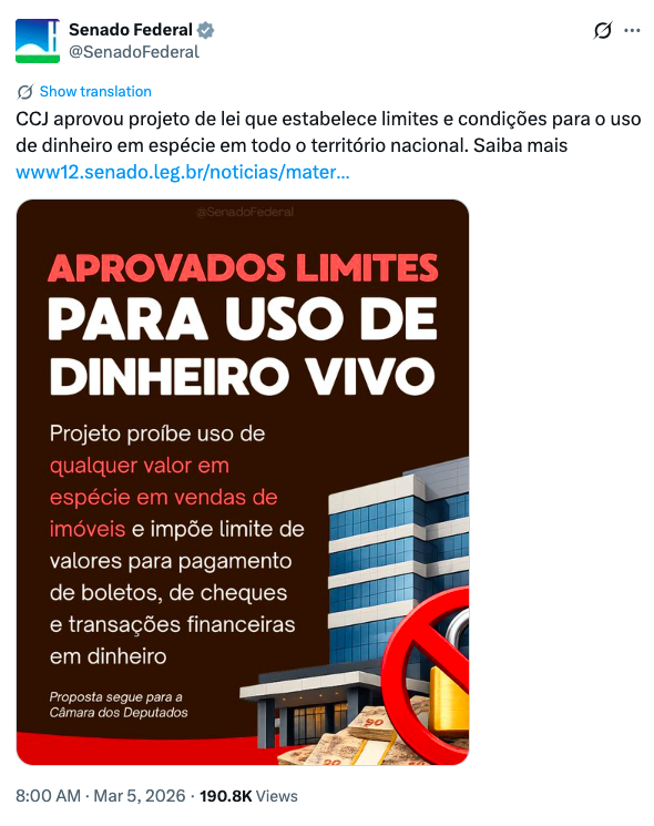 Apesar disso, o PL aprovado na CCJ mira justamente o dinheiro vivo do cidadão comum: o pedreiro que recebe pagamento em espécie, a diarista, o ambulante, o feirante. Nesses segmentos, o dinheiro físico ainda é a principal — e muitas vezes a única — forma de transação sem intermediários bancários.