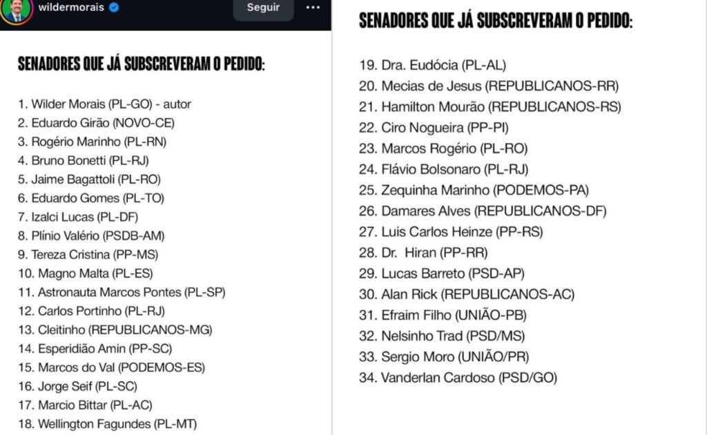 Lista completa dos senadores que assinaram o pedido (atualizada até 9 de janeiro de 2026)