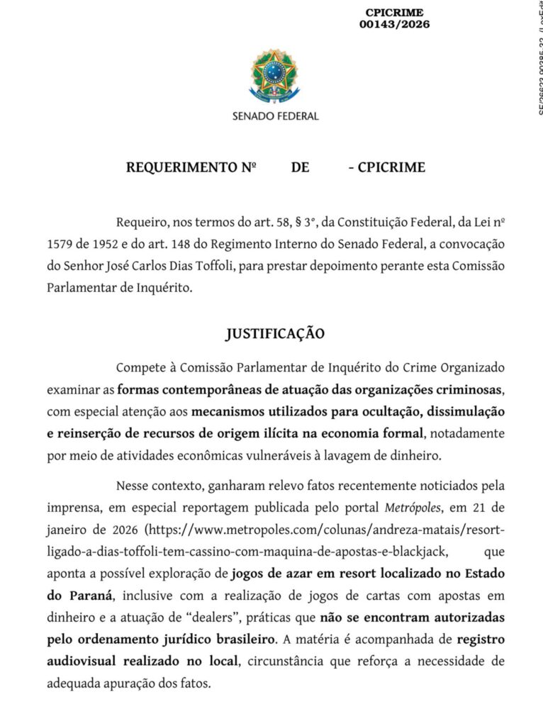 Até o momento, não há manifestação oficial do ministro Dias Toffoli ou dos convocados sobre os pedidos.