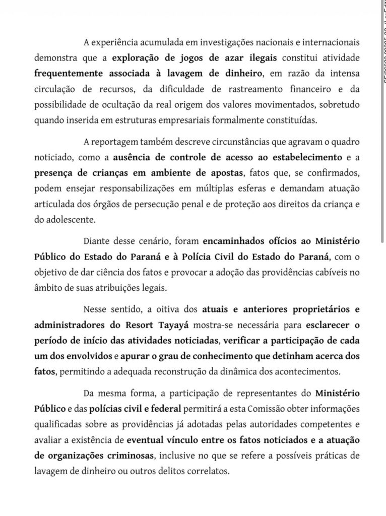Os requerimentos citam reportagem do portal Metrópoles que apontou a presença de jogos de azar no Resort Tayayá, empreendimento localizado em Ribeirão Claro (PR), que já teve os irmãos e o primo do ministro como sócios ou cotistas.