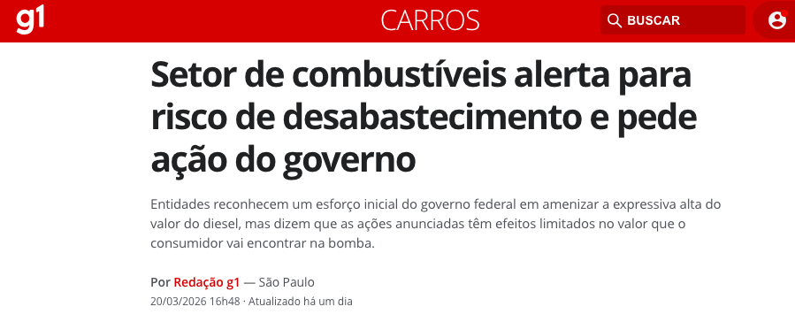 Entidades representativas do setor de combustíveis divulgaram nota conjunta nesta sexta-feira (20) cobrando do governo federal providências imediatas para reduzir o risco de desabastecimento de diesel no país. A alta expressiva do preço do petróleo, impulsionada pelo conflito no Oriente Médio, combinada com distorções internas na cadeia de suprimento, pressiona o mercado e ameaça a segurança energética brasileira, de acordo com a matéria do G1.