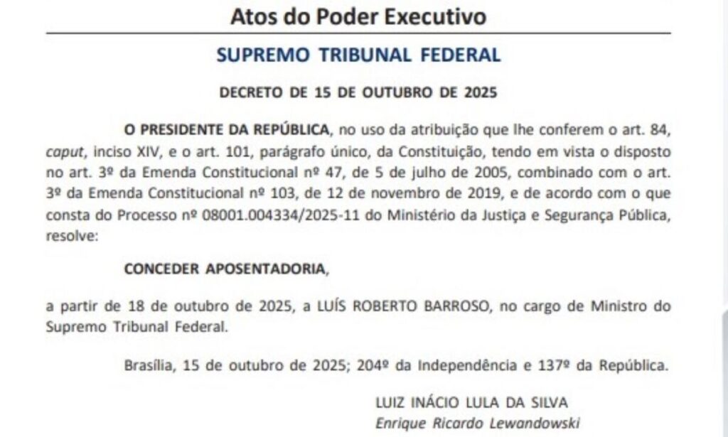 Nessa quarta-feira (15), foi publicado o decreto presidencial no DOU (Diário Oficial da União), assinado por Lula da Silva (PT), que concede aposentadoria ao ministro a partir deste sábado (18).