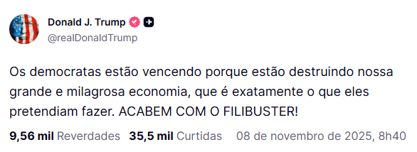 Com o maior shutdown da história do governo dos EUA chegando ao 39º dia neste sábado (8), o presidente Donald Trump afirmou que democratas estão “destruindo” a economia norte-americana.