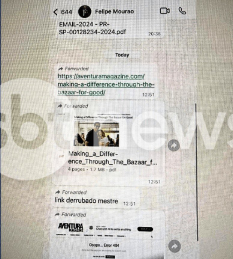 Em diálogo direto com Vorcaro, o “Sicário” confirmou a ação de derrubada de link: “link derrubado mestre”, e encaminhou o endereço do site Aventura Magazine como prova da remoção bem-sucedida.