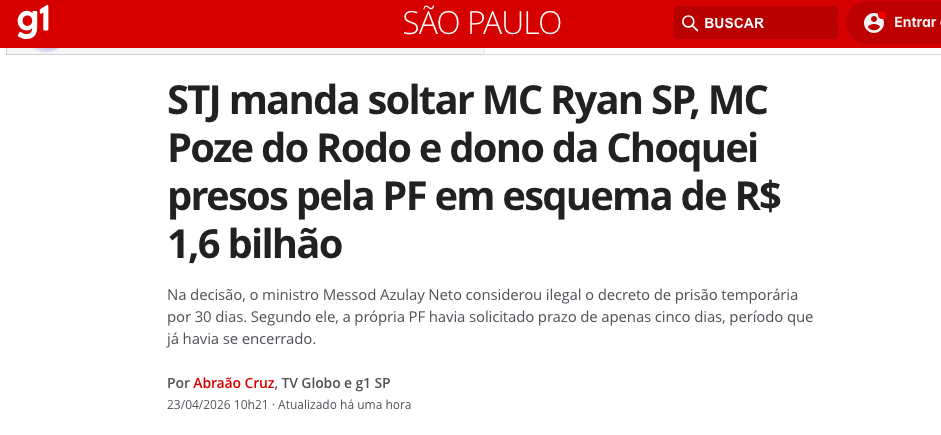 O cenário jurídico brasileiro foi movimentado nesta quinta-feira (23) com a decisão do Judiciário de soltar nomes centrais da recente operação da Polícia Federal. MC Ryan SP, MC Poze do Rodo e o empresário conhecido como Dono da Coqueiro receberam o direito de responder ao processo em liberdade. Os investigados haviam sido detidos sob acusação de envolvimento em um esquema bilionário de movimentação financeira ilícita.