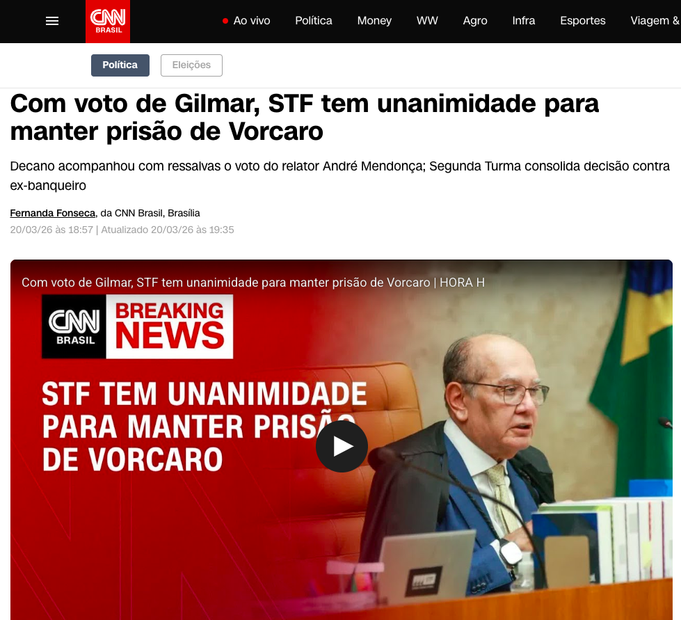 A Segunda Turma do Supremo Tribunal Federal (STF) formou unanimidade para manter a prisão preventiva do ex-banqueiro Daniel Vorcaro, ex-controlador do Banco Master, investigado na Operação Compliance Zero por suspeitas de fraudes financeiras e organização criminosa. O julgamento virtual, iniciado em 13 de março, foi concluído nesta sexta-feira (20) com o voto do ministro Gilmar Mendes, decano da Corte, de acordo com a matéria da CNN BRASIL.