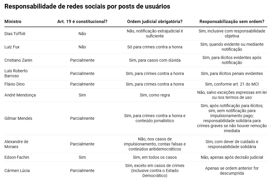 O colegiado considerou parcialmente inconstitucional o artigo 19 do Marco Civil, que condicionava a responsabilização das plataformas a ordem judicial prévia. Na nova leitura, o STF argumenta que a regra anterior deixava desprotegidos valores constitucionais, como a defesa da democracia.Desse modo, redes sociais, aplicativos de mensagens e portais poderão ser sancionados caso não impeçam conteúdos que atentem contra a ordem democrática ou direitos fundamentais.