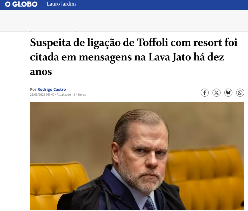 A suspeita, que circulava nos bastidores da Lava Jato, ganhou novo fôlego em 2026. Recentemente, o próprio Dias Toffoli admitiu ser sócio da Maridt Participações, empresa familiar que figura entre as proprietárias do resort Tayayá.