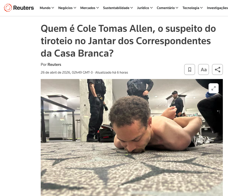 O homem preso após o tiroteio ocorrido no sábado (25) durante o tradicional jantar anual dos correspondentes da Casa Branca foi identificado como Cole Tomas Allen, um californiano de 31 anos que atua como professor em tempo parcial e desenvolvedor independente de jogos.