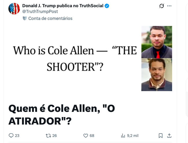 Cole Tomas Allen, de 31 anos, residente na Califórnia, foi detido após disparar contra agente do Serviço Secreto durante evento com presença de Donald Trump; autoridades ainda não identificaram o motivo do ataque