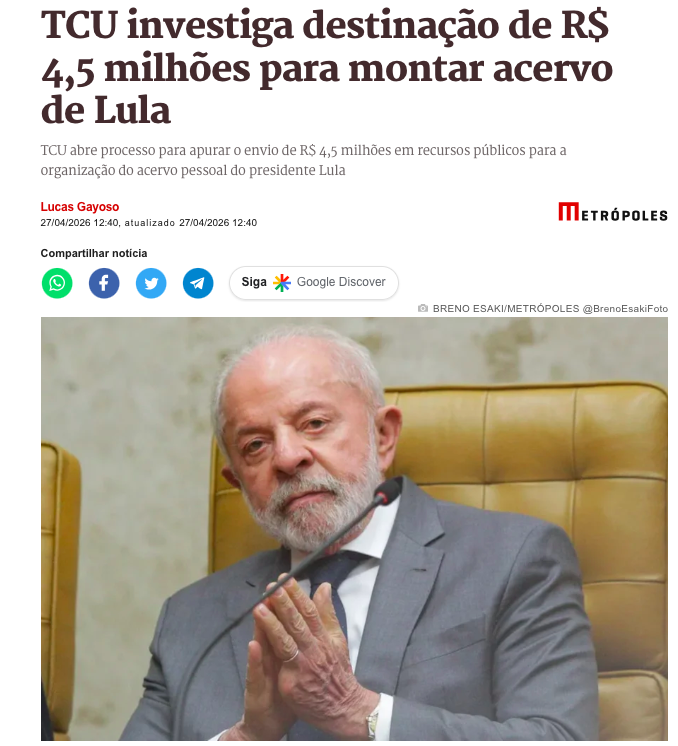 O Tribunal de Contas da União (TCU) decidiu abrir processo para investigar a destinação de R$ 4,5 milhões em recursos públicos federais destinados à organização do acervo pessoal do petista Lula da Silva. O material, que inclui documentos, fotografias, vídeos e outros itens acumulados ao longo de sua trajetória política, está sendo tratado em São Bernardo do Campo (SP).