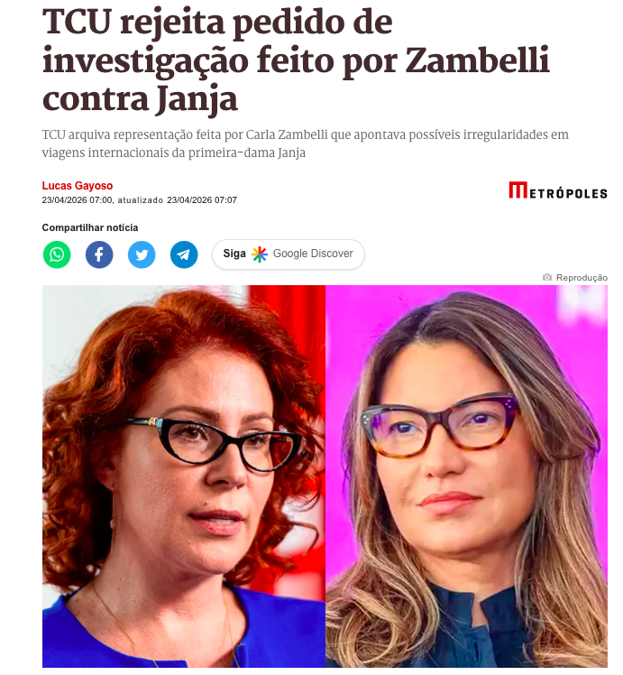 Home / TCU / TCU arquiva denúncia de Carla Zambelli contra a Janja Lula da Silva