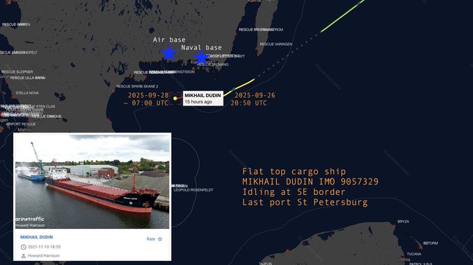 Paralelamente, um grande navio de carga russo, identificado como o “Mikhail Dudin”, foi avistado navegando próximo à costa de Karlskrona. O navio partiu de São Petersburgo, e sua presença coincidiu com os avistamentos de drones, aumentando as suspeitas de que essas atividades possam estar conectadas. A embarcação, registrada sob bandeira liberiana, é um dos maiores navios de carga da frota russa, e sua proximidade com uma base naval estratégica não passou despercebida.