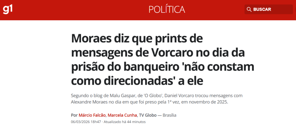 Novas mensagens trocadas entre Daniel Vorcaro, ex-controlador do Banco Master, e o ministro do Supremo Tribunal Federal (STF) Alexandre de Moraes foram reveladas em investigação da Polícia Federal. As conversas se estenderam por todo o dia da prisão do dono do Banco Master, em 2025.