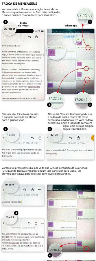 O diálogo ocorreu em novembro de 2025, no mesmo dia em que Vorcaro foi detido preventivamente pela primeira vez (antes de ser solto e preso novamente em março de 2026). As trocas aconteceram horas antes da liquidação extrajudicial do Banco Master pelo Banco Central, que apontou suspeitas de fraudes bilionárias, emissão de títulos falsos e lavagem de dinheiro.