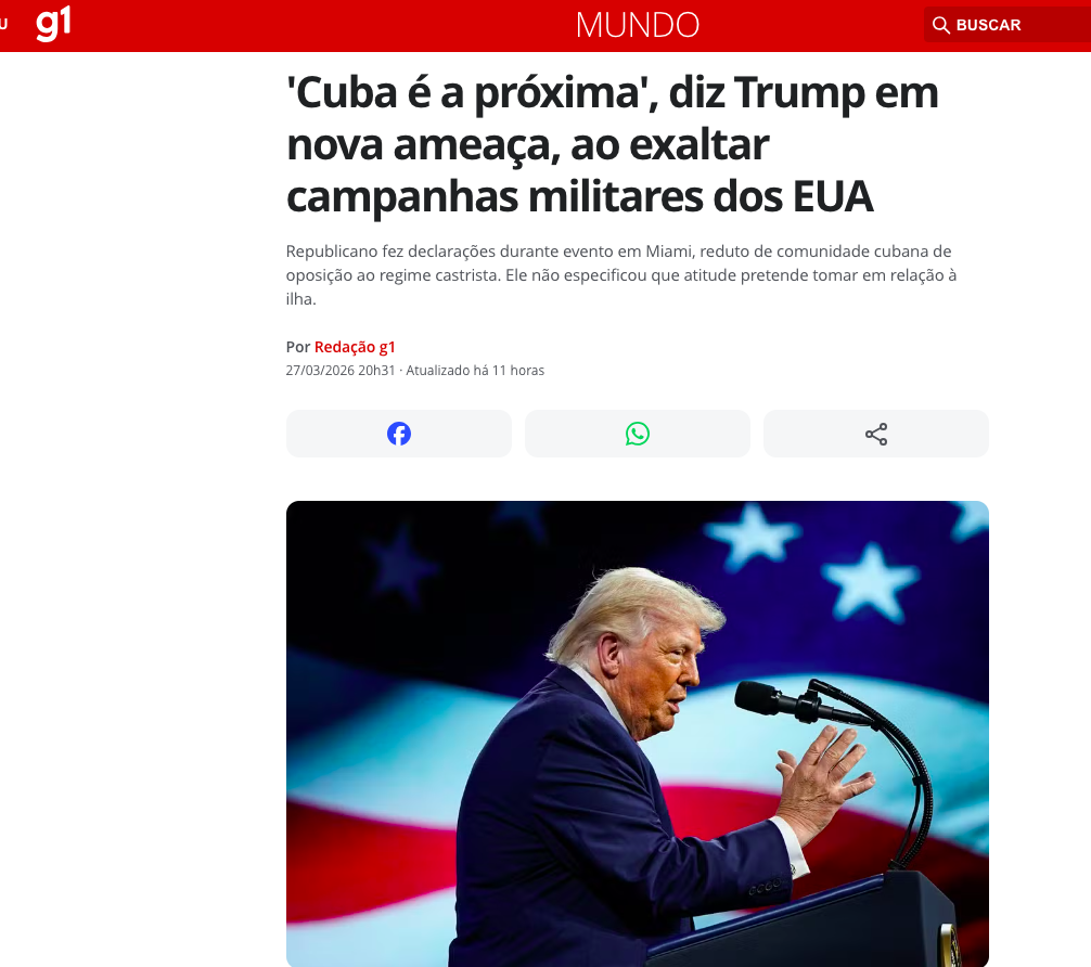 O presidente dos Estados Unidos, Donald Trump, declarou nesta sexta-feira (27) que “Cuba é a próxima” ao exaltar as recentes campanhas militares americanas. A declaração foi feita durante um fórum de investimentos em Miami, cidade com forte presença da comunidade cubana exilada e opositora ao regime de Havana, de acordo com a matéria do G1.