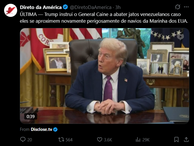 A declaração surge após dois aviões do país sul-americano terem se aproximado de um navio da Marinha dos EUA em águas internacionais na quinta-feira (4). Trump evitou especificar a que distância as aeronaves chegaram dos navios americanos.