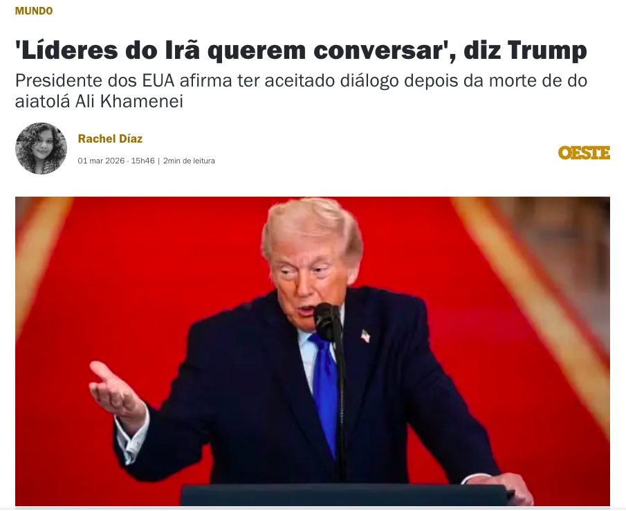 O presidente dos Estados Unidos, Donald Trump, revelou em entrevista à revista The Atlantic neste domingo (1º de março de 2026) que a nova liderança transitória do Irã manifestou interesse em iniciar conversas com ele, e que aceitou o diálogo.