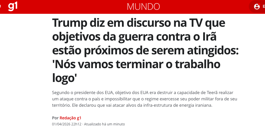 O presidente dos Estados Unidos, Donald Trump, afirmou nesta quarta-feira (1º) que os principais objetivos estratégicos dos EUA na guerra contra o Irã estão próximos de serem alcançados. O pronunciamento foi feito em rede nacional de televisão, em meio ao conflito que já dura cinco semanas.