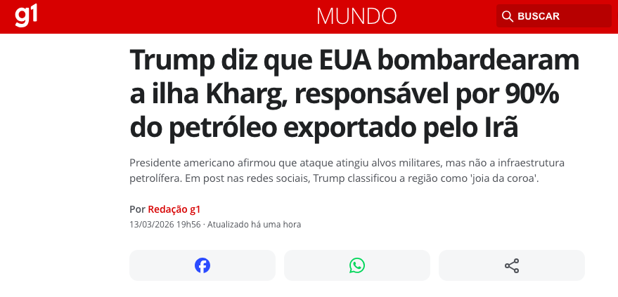 O presidente dos Estados Unidos, Donald Trump, declarou que as forças americanas bombardearam a ilha de Kharg, descrita por ele como “a joia da coroa do Irã”. A declaração foi feita em postagem na rede Truth Social e em pronunciamento à imprensa, confirmando a participação direta dos EUA na operação aérea conjunta com Israel contra infraestrutura crítica iraniana, de acordo com a matéria do G1.