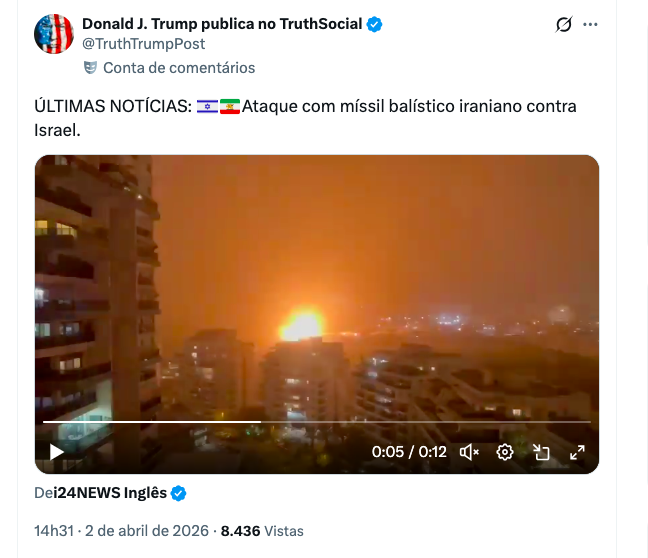 Na publicação, Trump escreveu de forma direta: “Ataque com míssil balístico iraniano contra Israel.”