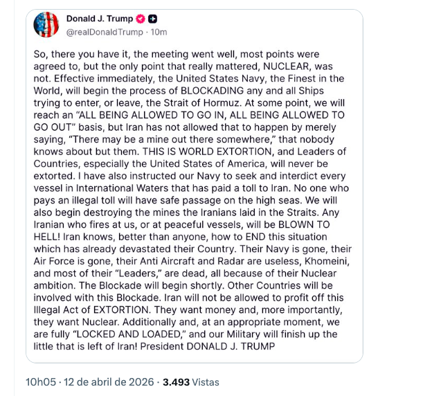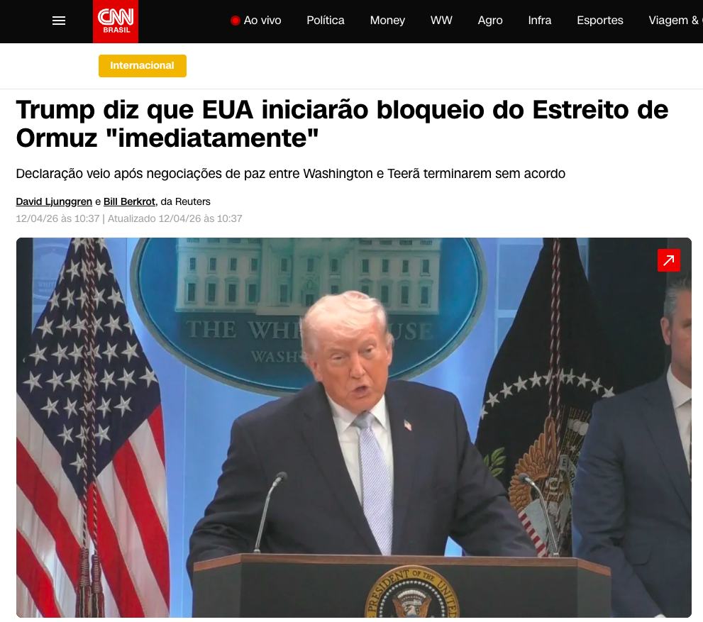 O presidente Donald Trump anunciou neste domingo (12) que a Marinha dos Estados Unidos iniciará imediatamente o bloqueio de todos os navios que tentarem entrar ou sair do Estreito de Ormuz, principal rota de escoamento de petróleo do mundo, após o fracasso das negociações presenciais com o Irã em Islamabad, de acordo com a matéria da CNN BRASIL.