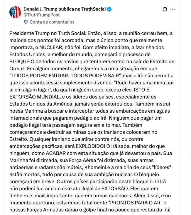 “Também começaremos a destruir as minas que os iranianos colocaram no Estreito. Qualquer iraniano que atirar contra nós, ou contra embarcações pacíficas, será EXPLODIDO!”