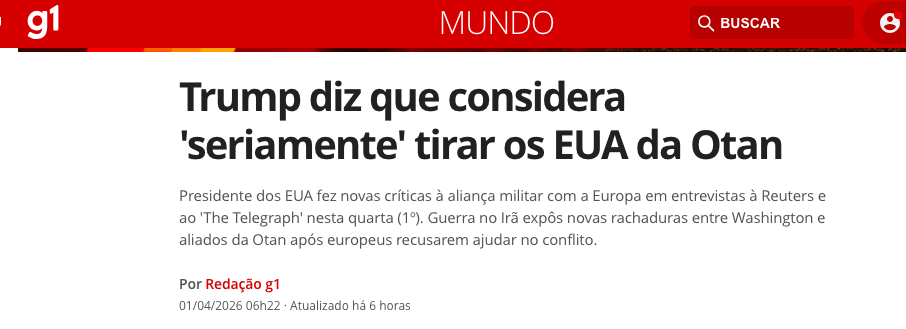 As declarações ocorrem em um momento de forte tensão: Trump cobrou maior engajamento europeu na crise com o Irã, mas recebeu respostas negativas de líderes como Emmanuel Macron e outros chefes de governo. Fontes próximas à Casa Branca indicam que o presidente avalia seriamente a retirada americana da aliança, algo que já ameaçou em mandatos anteriores.