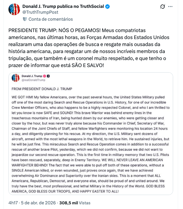 O presidente acrescentou que o piloto estava “atrás das linhas inimigas, nas traiçoeiras montanhas do Irã, sendo caçado” e sofreu alguns ferimentos, mas “ficará bem”. Trump ainda enfatizou: “NUNCA DEIXAREMOS UM COMBATENTE AMERICANO PARA TRÁS!” e concluiu desejando “DEUS ABENÇOE OS ESTADOS UNIDOS DA AMÉRICA, DEUS ABENÇOE NOSSAS TROPAS E FELIZ PÁSCOA A TODOS!”.